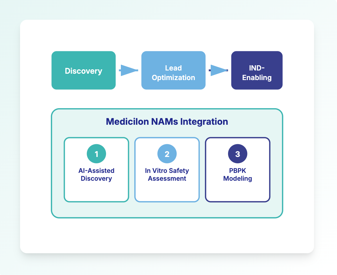 Medicilon supports: Context-of-use definition; Fit-for-purpose NAM module selection; Weight-of-evidence integration; Clear reporting to support NAMs IND-enabling packages.