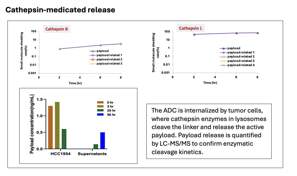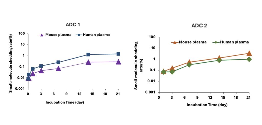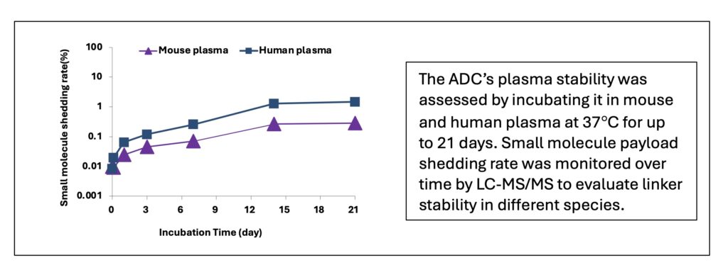 ADC plasma stability was assessed in mouse and human plasma over 21 days at 37°C, with small molecule payload shedding monitored by LC-MS/MS to evaluate metabolic stability across species.